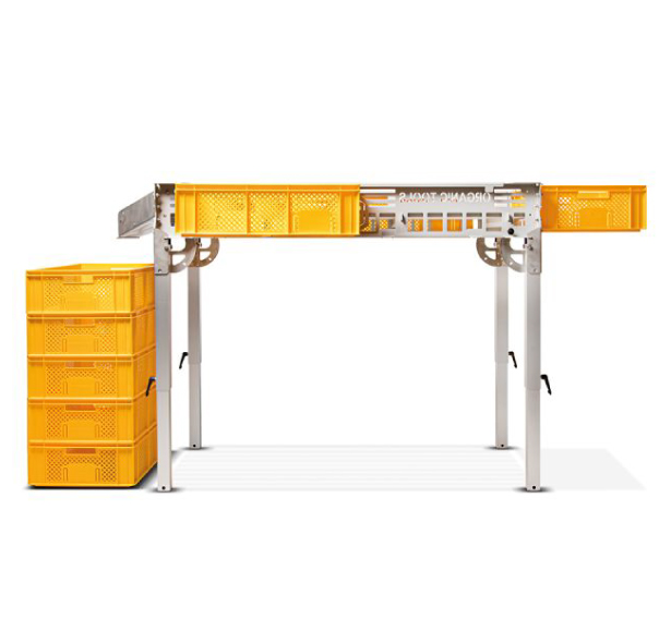 Realizat din aluminiu si otel inoxidabil, poate fi asamblat cu palnia (otel inoxidabil) pozitionata direct deasupra cutiilor de depozitare. Înălțimea picioarelor pliabile poate fi reglată individual pentru a adapta masa la teren și înclinația necesară.