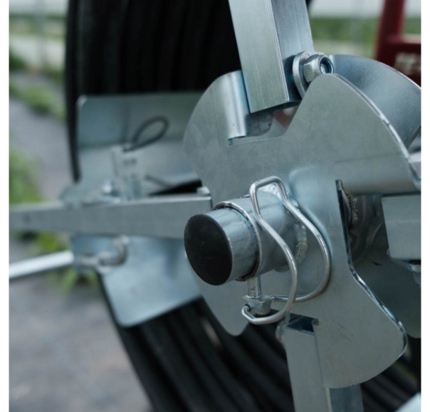 Când derulați furtunurile de irigare, pur și simplu repoziționați noua bobină pe tamburul de bobinare, care va asigura tensiunea folosind un arc. Acest lucru facilitează operațiunile de înfășurare în câmp deschis. Acest cărucior cu role facilitează depozitarea furtunurilor de irigare, optimizând în același timp spațiul de depozitare disponibil.
