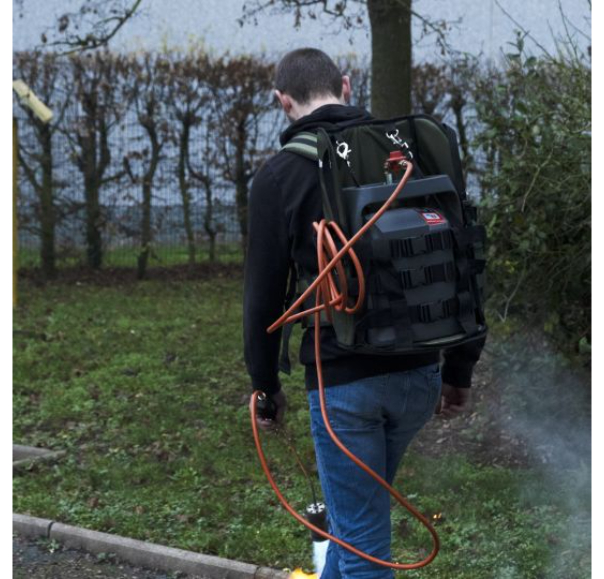 Rucsacul cu butelie de gaz Terrateck a fost conceput pentru producători în timpul operațiunilor de plivire termică pe paturile de grădinărit.
