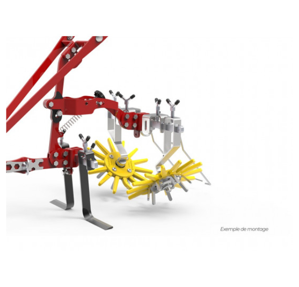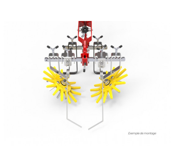 Tensiunea arcului pe sol poate fi reglată pentru a evita prășirea excesiv de agresivă care ar putea smulge plantele în creștere. Montat pe sapa cu roată dublă cu ajutorul accesoriului secundar de scule, vă va permite să luați măsuri asupra plantelor tinere și să limitați creșterea buruienilor în rând.