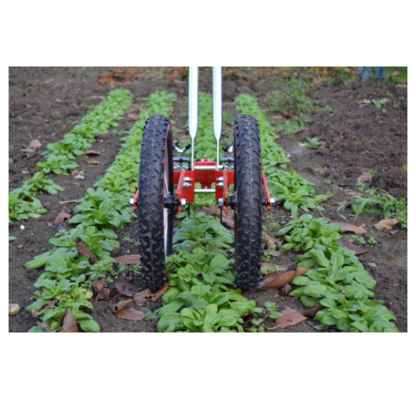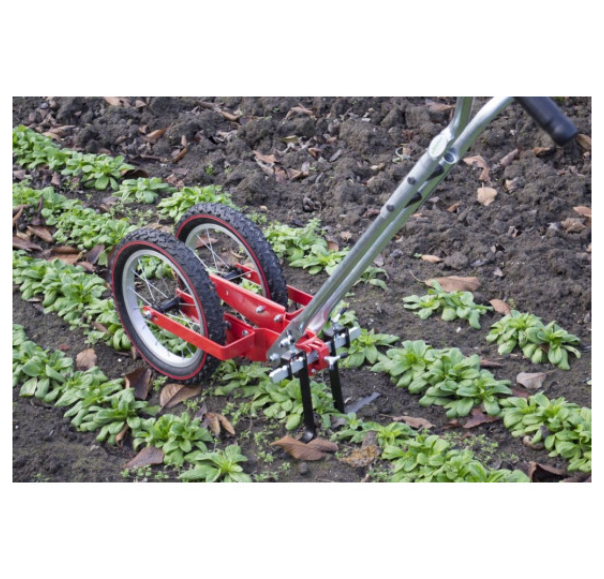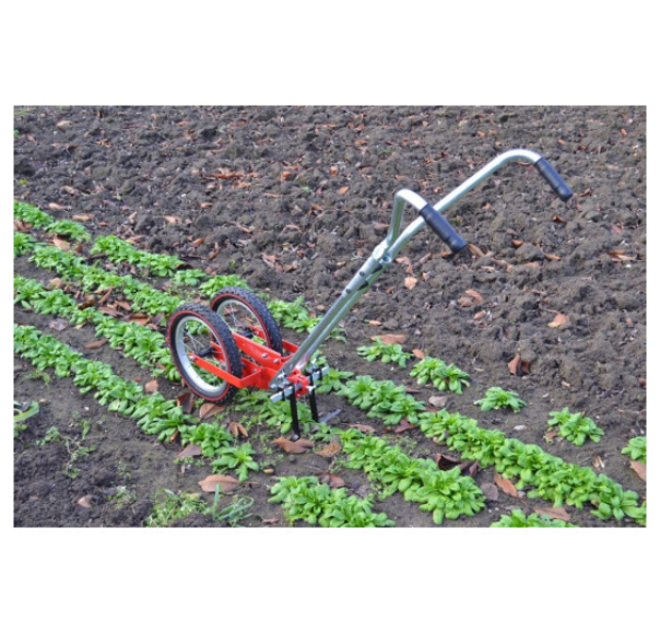 Sapă de grădinărit cu două roți pentru grădinarii amatori care pliviți într-o grădină de legume.