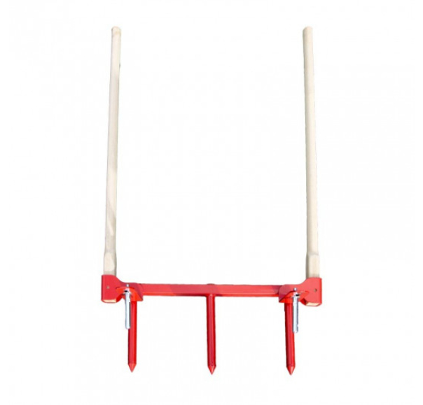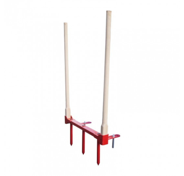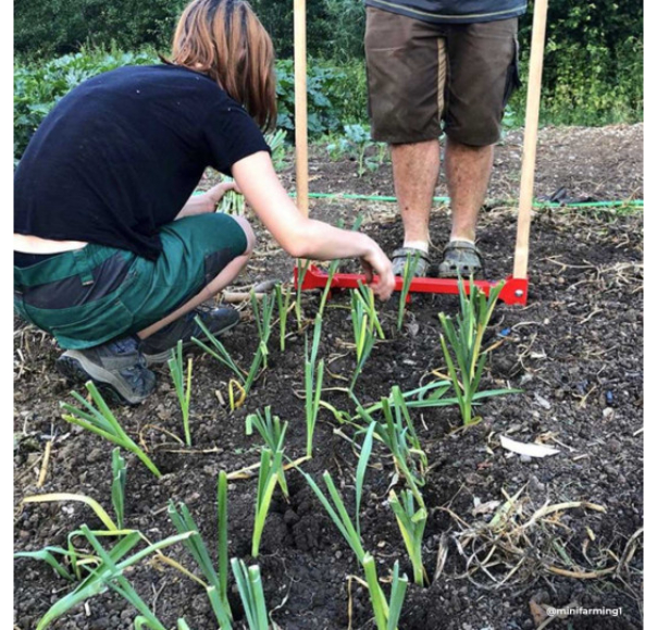 Pentru a face gaura pentru praz, țineți pur și simplu dibblerul cu ambele mâini și împingeți-l în pământ cu piciorul. Există un gabarit reglabil pentru gestionarea distanței dintre plante. Folosește marcatorul pentru a planta prazul uniform.